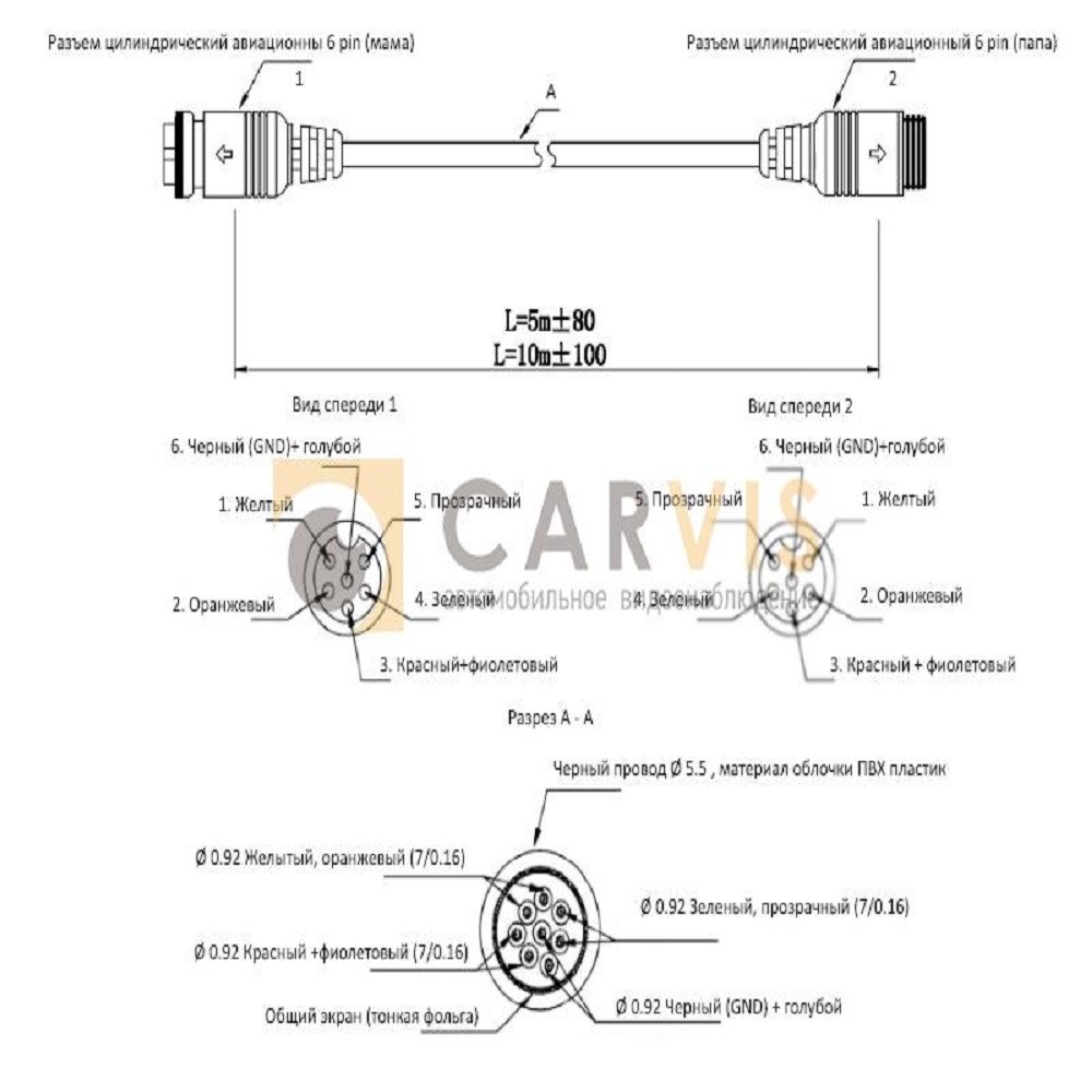 Переходник по типу витая пара, позволяющий соединить между собой автомобильный регистратор и IP-камеру. Длина кабеля — 5 метров позволяет устанавливать видеонаблюдение не только в легковые автомобили, но и спецтранспорт. С одной стороны переходника 6-пиновый авиационный штекер (папа), с другой — 6-пиновый авиационный штекер (мама).